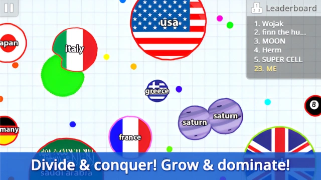 With new controls developed especially for touchscreens, agar.io offers the same fun gameplay that millions have already enjoyed on PC. Play online in free-for-all action and use splitting, shrinking and dodging tactics to catch other players - or avoid them! Use a variety of special secret skins with the right username!