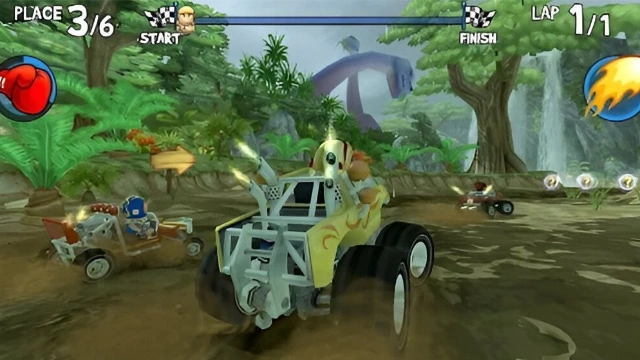 Explore dinosaur-infested jungles, lava-spewing volcanoes, beautiful beaches, and mysterious swamps. Each unique race track is packed with hidden shortcuts and surprises.