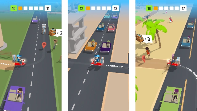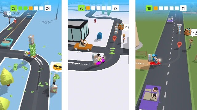 Pick up and drop off packages to customers to earn money and level up. Explore the world and discover new zones.