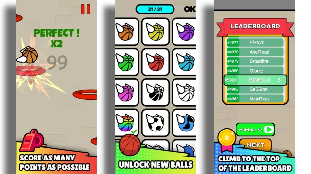 Players tap to make the ball jump and navigate through hoops. The objective is to pass through as many hoops as possible without missing. Players can also collect different skins for the ball and tackle various challenges to keep the game exciting.