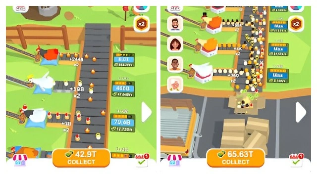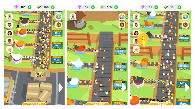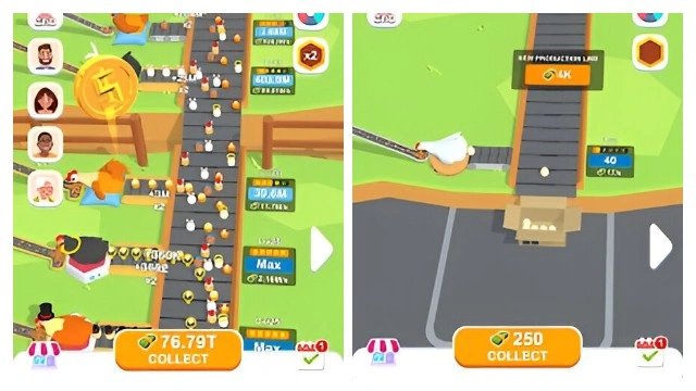 Starting with a small factory, the eggs are packaged and sold. Use the money to upgrade. The higher the level, the faster the laying speed and the more the price. Open up a new production line and stuff your boxes with your eggs.