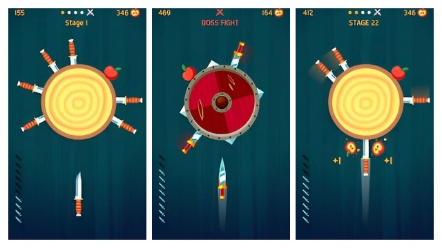 Throw the knives into the logs to break them. Slash the apples and unlock new knives. Each 5th stage is defended by a boss - beat them to get exclusive knives!