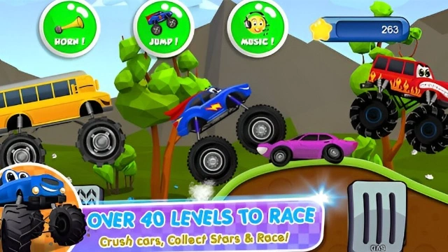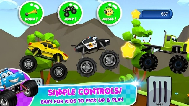 Crush the cars along the course with the monster machines, Collect stars, Fireworks and balloon popping are at the end of each level to give more excitement to the kids playing.
